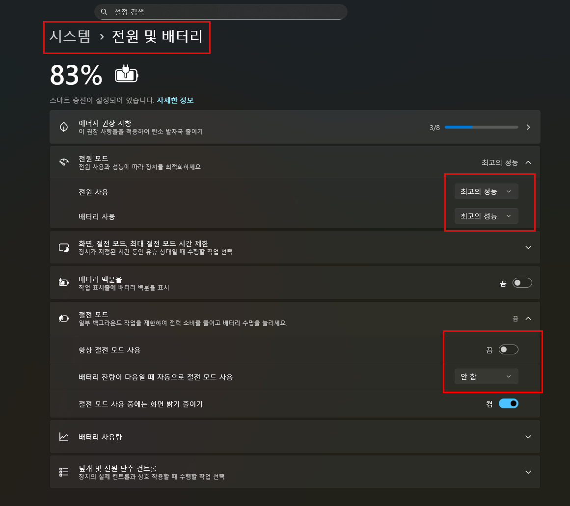3) 전원모드 내 전원사용 및 배터리 사용 '최고의 성능' 로 설정